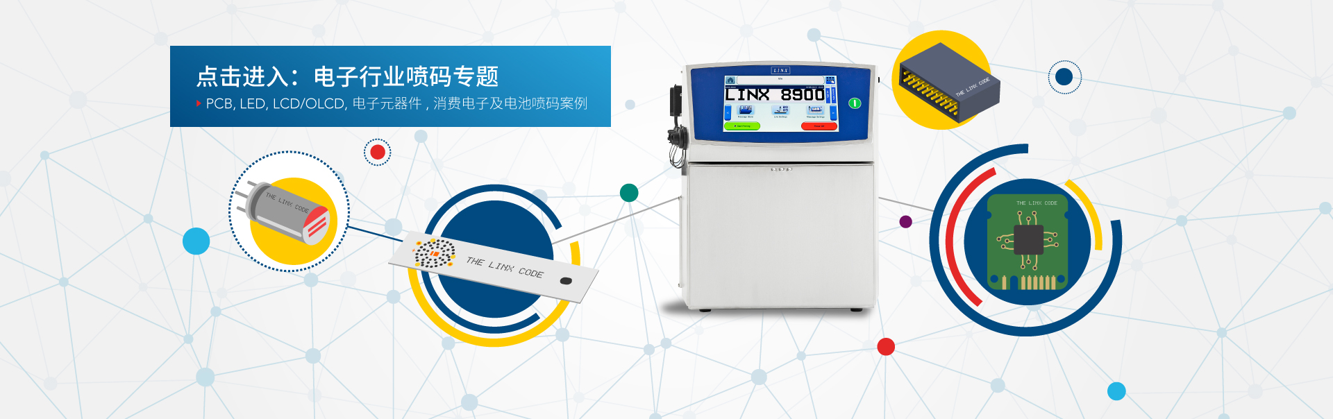 Linx連續(xù)噴墨噴碼機可為苛刻生產環(huán)境中的電子元器件提供可靠的產品標識碼。標碼高度低至 1.4 毫米 (CIJ) 和 0.8 毫米。